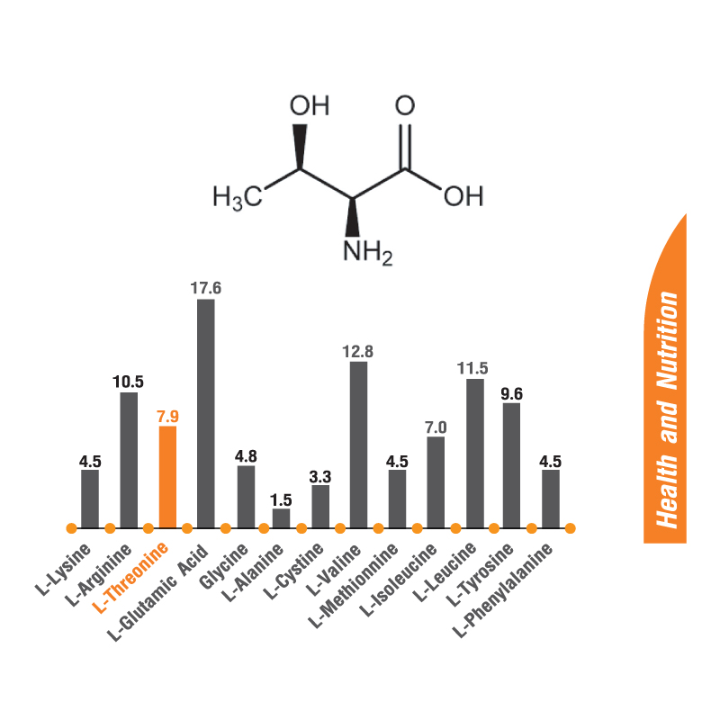 ทรีโอนีน ( Threonine ) ช่วยเพิ่มภูมิคุ้มกัน ช่วยเผาผลาญไขมัน และมีส่วนสำคัญในการสร้างกรดอะมิโนไกลซีน ซึ่งสำคัญต่อการสร้างโปรตีนอีกหลายชนิด เช่น สารเคลือบฟัน คอลลาเจน ( Collagen ) และอิลาสติน ( ELastin ) ช่วยในการเผาผลาญไขมันและป้องกันการสะสมของไขมันในตับ ต้านการเกิดแผลเรื้อรังและมีประโยชน์ต่อความผิดปกติของลำไส้และการย่อยอาหาร ทำให้การทำงานของลำไส้ระบบการย่อยและการดูดซึมสารอาหารดีขึ้น